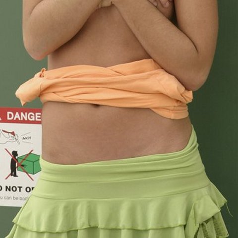 I have these thoughts about going bottomless more and more often, now, and they're scaring me a little bit. Every time I think about it my heart races, and my pussy gets a little wet. I know I'll have to do something to stop myself from taking off my panties, but for a long time I didn't know what to do. The thing that kept coming back into my mind was my t-shirt, and how it would cover me. Then I knew what I had to do. In order to force myself to keep my panties on in public, I needed to get rid of the t-shirt. For some time now, I've been sneaking out of the house fully clothed, and taking off my top in the back yard before hopping the fence and going out shopping. Sure people stare at me because not too many girls go shopping wearing only a pair of panties, but the urge to take off my panties has practically gone away, now that I can't hide them. I feel snug in my panties, and I know I'm covered up where it counts. I don't have to worry about bending over, and I don't have to panic at thoughts of going up the escalator bottomless, and having some old guy looking up my crotch.